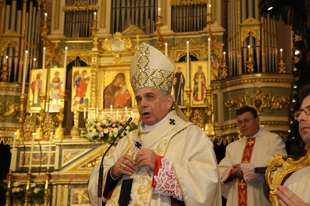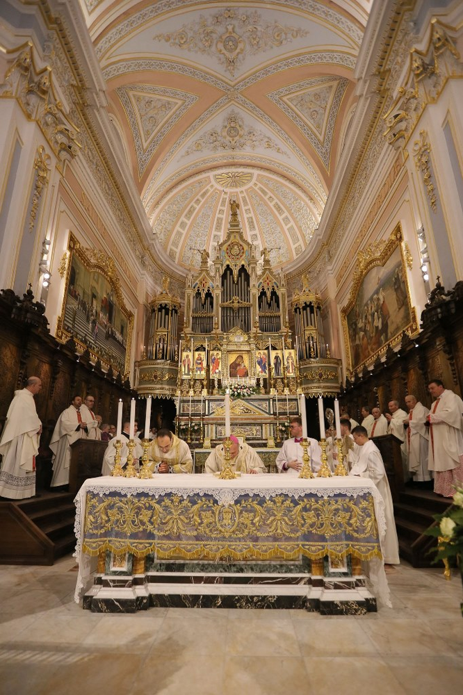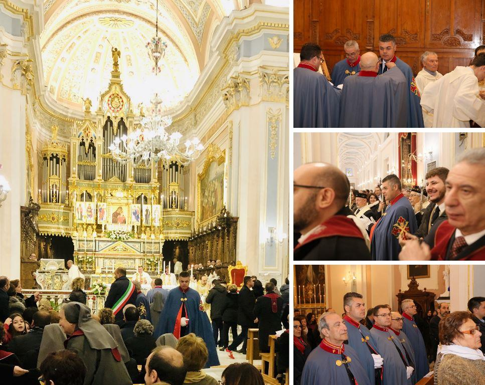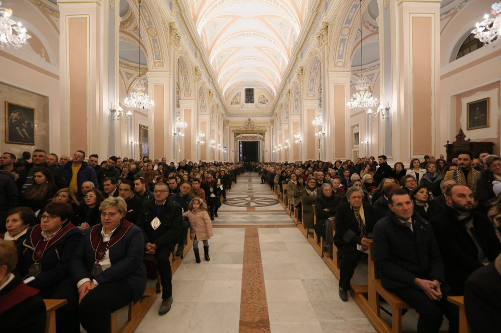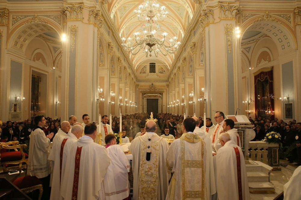 Alle ore 19.00 ha avuto inizio la Concelebrazione Eucaristica. Don Salerno, che immediatamente dopo sisma si era attivato per i lavori, terminati in tempi tecnici tutto sommato brevi grazie alla sua caparbietà e tenacia, nel suo saluto all’Arcivescovo, ha elencato i lavori fatti e ha ringraziato il popolo e quanti hanno contribuito con generosità, specialmente tutti gli enti preposti alla tutela e alla salvaguardia del patrimonio storico-artistico: Protezione Civile, Comune di Biancavilla, Ufficio Beni Culturali della Curia Metropolitana, Soprintendenza, nonché progettisti e maestranze locali che con dedizione e autentica passione hanno reso possibile la restituzione del gioiello più insigne della città. “I lavori durati nove mesi – ha confessato il Prevosto – sono come per una madre che dà alla luce una nuova vita. Saremo testimoni di un evento storico”.