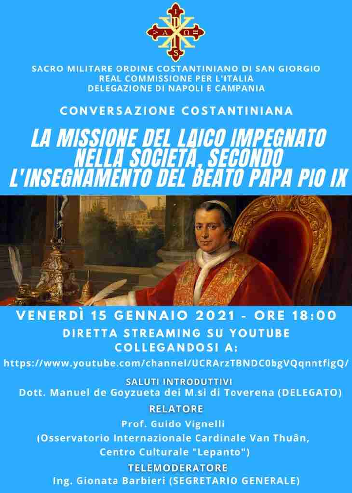 Venerdì 15 gennaio 2021 alle ore 18.00 è programmata una nuova Conversazione Costantiniana online, in diretta streaming sul canale YouTube della Delegazione di Napoli e Campania del Sacro Militare Ordine Costantiniano di San Giorgio.