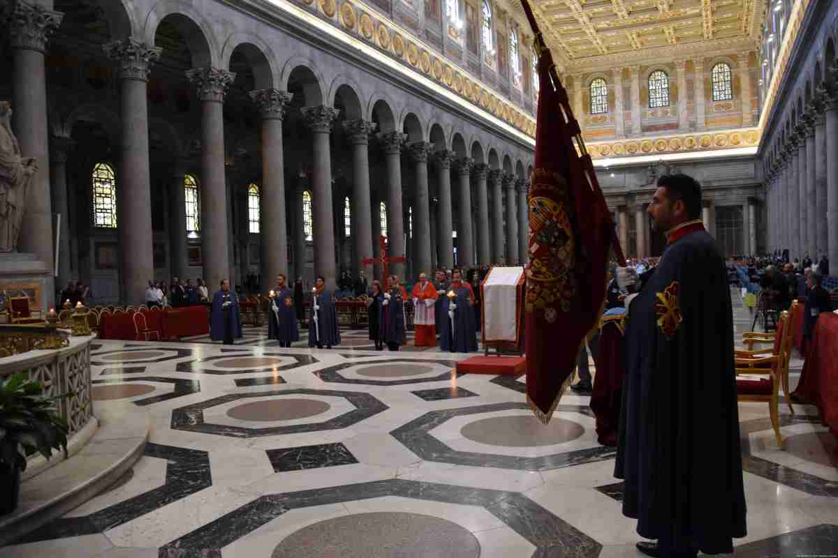 Percorsa la navata centrale della basilica, S.A.R. il Gran Maestro ha sostato innanzi ai gradini dell’Altare della Confessione. Frattanto il Clero dell’Ordine ha raggiunto la propria posizione sul presbiterio, mentre i Dignitari dell’Ordine hanno sostato dietro a S.A.R. il Gran Maestro unitamente alla Reale Magistrale Famiglia. Gli altri Membri dell’Ordine sono rimasti in formazione al centro, per poi disporsi all’ordine dei cerimonieri nei reparti loro propri.